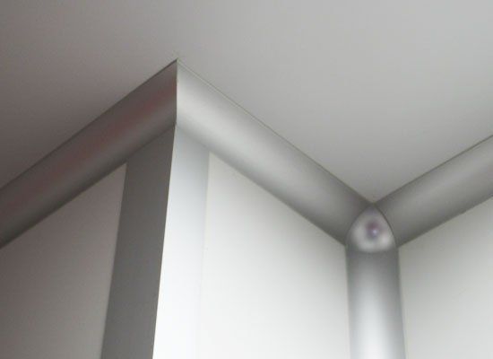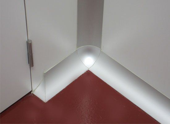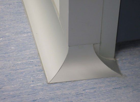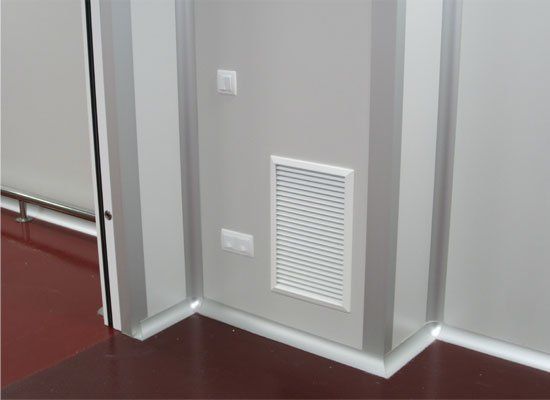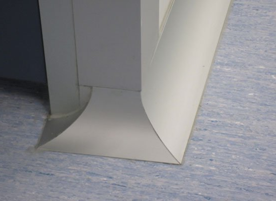 En aplicación especial para salas limpias, las uniones verticales entre paredes y las horizontales con suelos y techos se realizan mediante perfiles de aluminio anodizado o PVC en forma de escocia con radio de 52 mm.